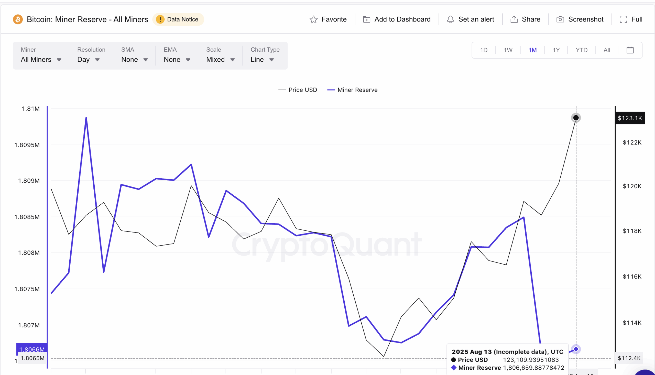 Earlier this month, miner reserves swelled from 1,806,790 BTC on August 2 to 1,808,488 BTC on August 10. This raised the risk of a supply wave hitting the market. This uptick reflected higher sell-side pressure from miners—a move often seen as a headwind for rallies.