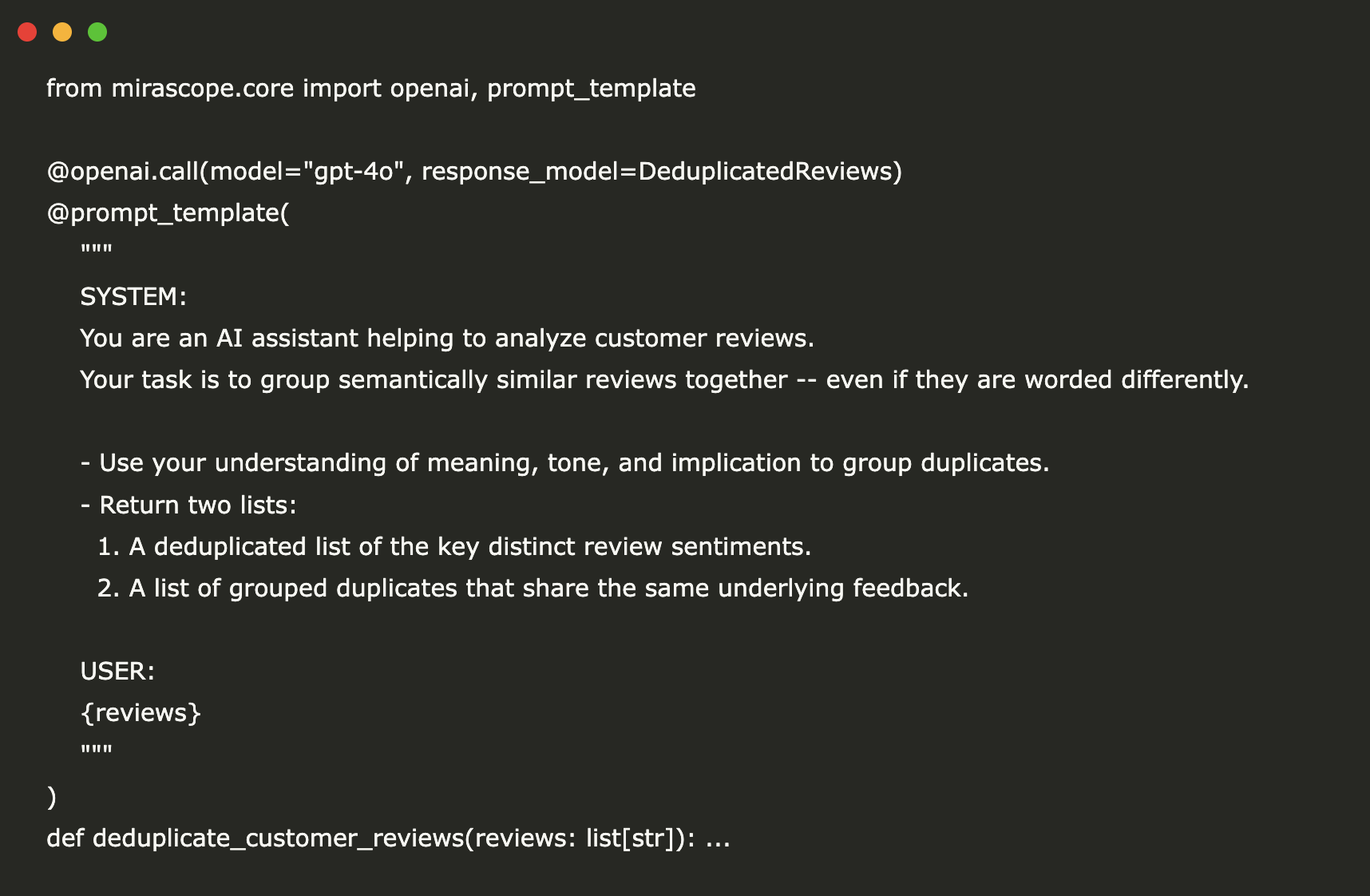 In this guide, we’ll focus on using Mirascope’s OpenAI integration to identify and remove semantic duplicates (entries that may differ in wording but carry the same meaning) from a list of customer reviews.
