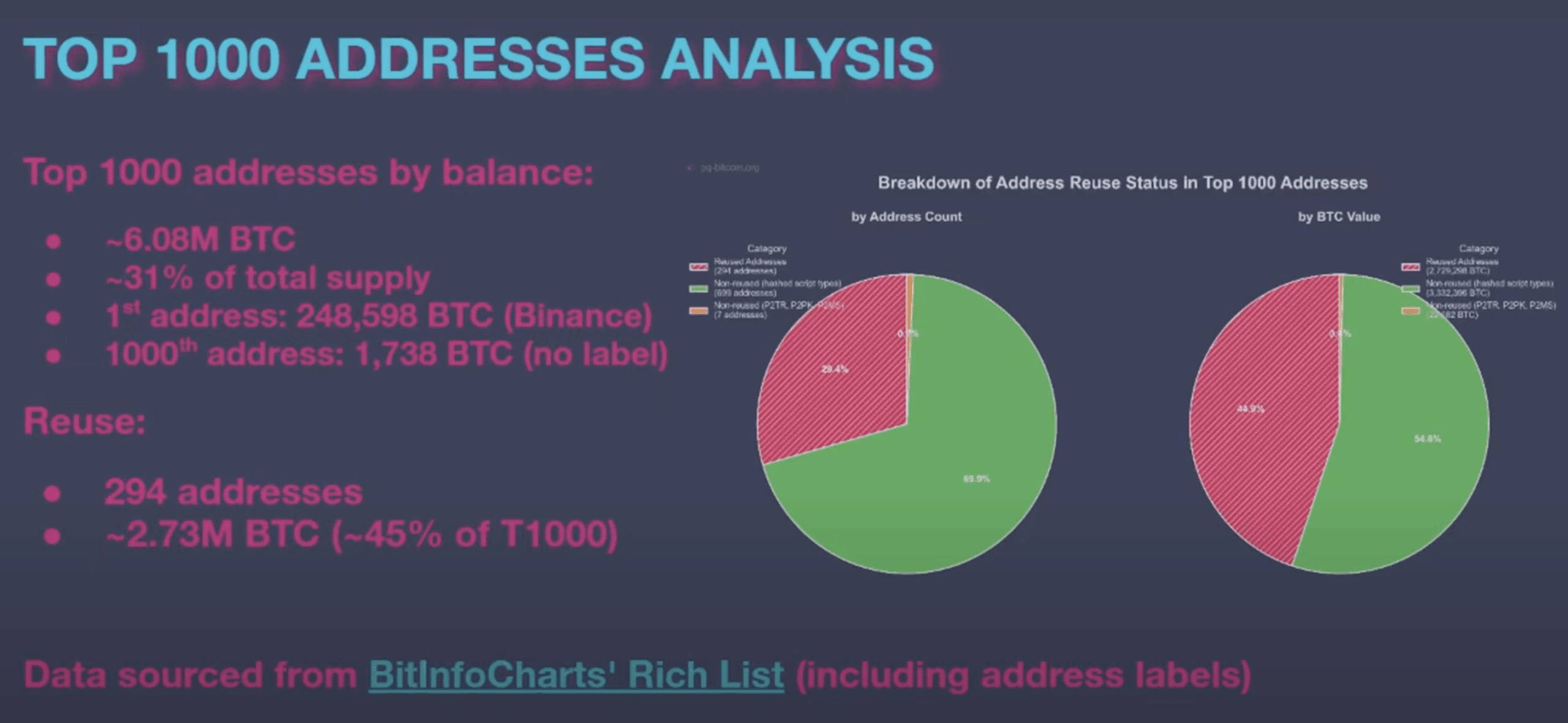 Milton also assessed the top 1000 Bitcoin addresses, which hold about 6.08 million, 30% of Bitcoin’s total supply. He concluded that many of these addresses are again reused, which only adds to the quantum vulnerability.